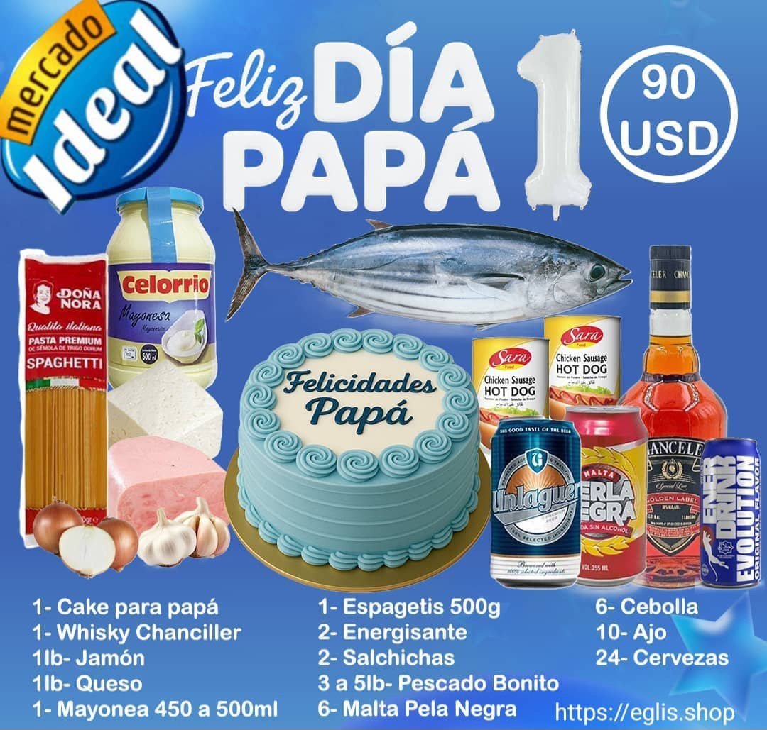 Cake para papá 1- Whisky Chanciller 1lb- Jamón 1lb-Queso 1- Mayonea 450 a 500ml 1- Espagetis 500g 6- Cebolla 2- Energisante 10- Ajo 2- Salchichas 24- Cervezas 3 a 5lb- Pescado Bonito 6- Malta Perla Negra